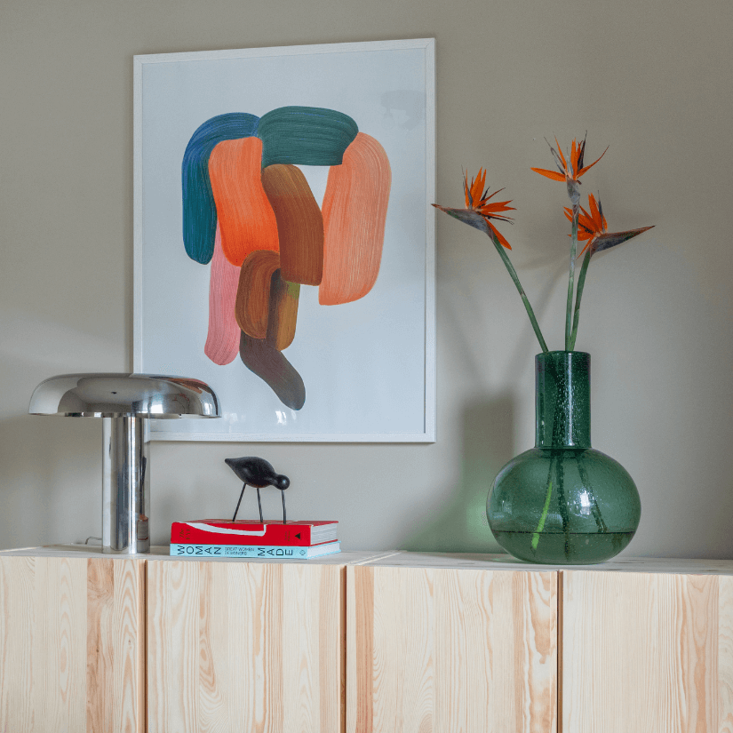 - Balans is de sleutel. Combineer rustige en ingetogen elementen met uitgesproken items, zodat er een harmonieus geheel ontstaat. Zo voorkom je dat het te druk of juist te vlak wordt, en creëer je een interieur dat uniek is én rust uitstraalt. Kies je bijvoorbeeld voor een kleurrijk kunstwerk, laat dan de tinten uit dat kunstwerk subtiel terugkomen in andere elementen van de ruimte. Dat verzacht de uitspatting en maakt het geheel samenhangend en in balans.