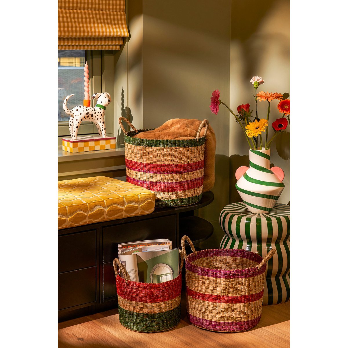 De Stratt vaas van Mica Decorations valt op door het unieke ontwerp met groene streep en roze handvatten. Handgemaakt keramiek, geschikt als decoratief stuk of voor bloemen.